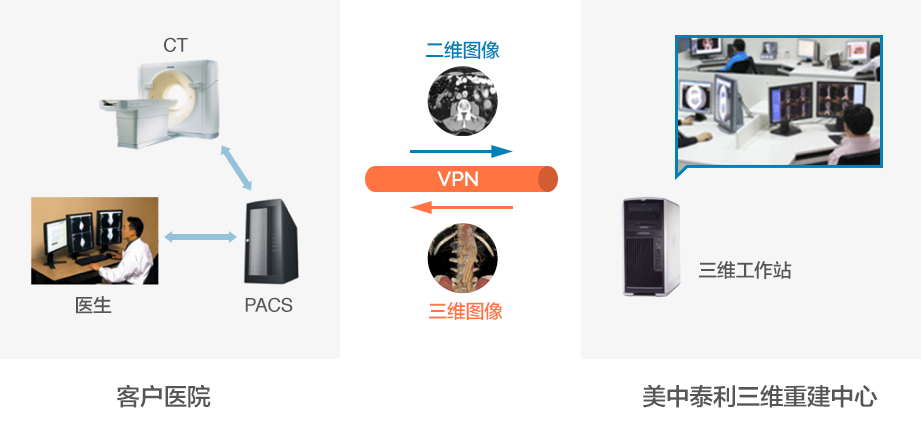 医学图像(主要是CT、磁共振图像)的三维重建已经成为临床实践中一项不可缺少的技术服务。随着临床影像需求的不断多样化、复杂化,医疗机构在如何为医生提供高质量、成本合理的三维重建解决方案上,面临着巨大的挑战。美中泰利是一家国际性的医学图像后处理第三方服务机构。公司多年来培养了一支经过专门培训、熟练掌握三维重建技术的临床和影像医师队伍;拥有先进的医学影像图形工作站和经过临床验证的人体各部位、各病种三维重建方案。美中泰利与客户医院的临床团队紧密合作,用先进的医学图像后处理技术为临床诊疗提供影像学支持。公司目前为中美两国上百家医院提供每天24小时、全年不间歇的医学图像三维重建服务。
